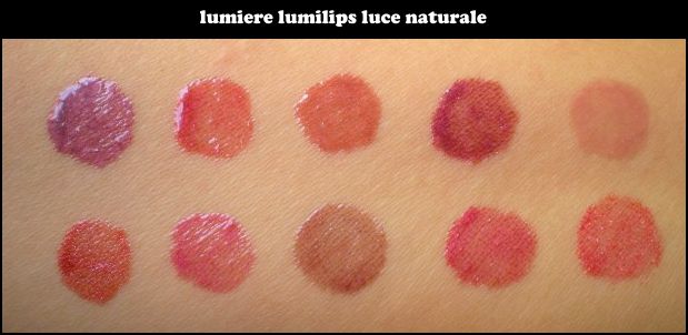 Le lumilips sono sostanzialmente dei rossetti lucidi molto leggeri (tranne qualcuno che è trasparente),la copertura delle labbra non mi risulta molto uniforme e i colori non sono ben definiti al punto che ho avuto difficoltà nei swatches a distinguerli. Questa è la ragione per cui nelle fotografie mancano i nomi dei colori, tuttavia nel sito di lumiere esistono i swatches fatti da loro per ogni prodotto che vendono quindi si può scegliere facilmente. Inoltre la consistenza non mi è piaciuta molto, non mi hanno entusiasmato anche in riferimento al prezzo molto elevato. Le lumilips non solo sono poco coprenti, ma hanno una durata molto limitata, sulle mie labbra asciugano piuttosto in fretta. Ho trovato i colori carini ma un pò banali e ripetitivi.