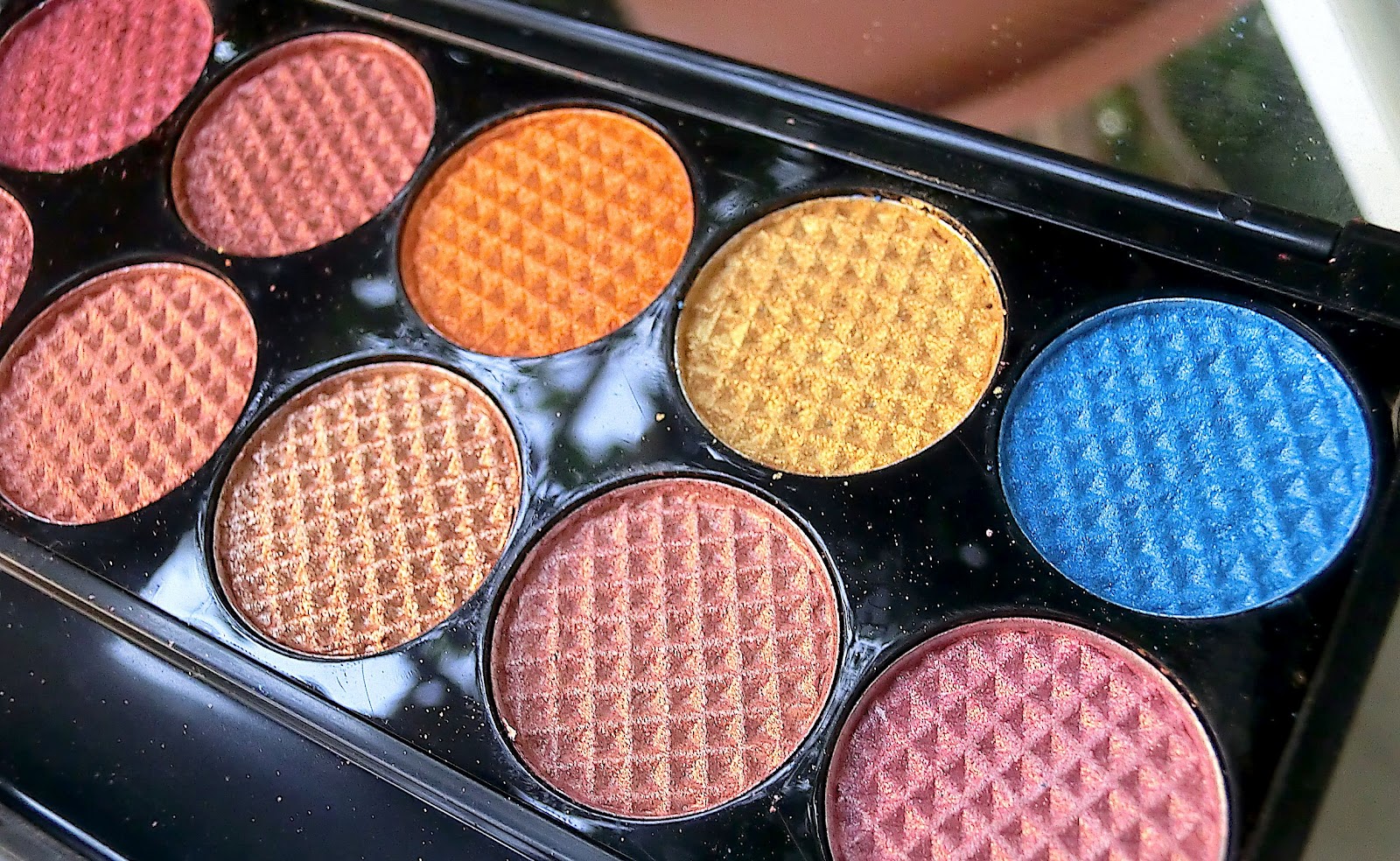 A differenza delle altre palette della sleek di cui ho parlato nel blog, nella sunset i colori sono tutti shimmer, l'unico opaco è il nero; la perlatura è molto evidente e rende questi ombretti molto luminosi. Gli ombretti sono come al solito tutti molto pigmentati, la copertura è ottima, la texture è quasi cremosa al punto che ho avuto qualche difficoltà nello sfumare un colore nell'altro. La tenuta è assolutamente soddisfacente; sebbene io usi sempre sotto gli ombretti la too faced shadow insurance, sono convinta che i colori restino a lungo anche senza primer proprio a causa della loro consistenza. Non vi nascondo che amo molto la sunset anche se tutto sommato preferisco la original, l'unico difetto che secondo me ha questa palette è la mancanza di varietà, ci sono troppi colori simili e si finisce per confonderli, ovviamente sono comunque diversi l'uno dall'altro ma non come accade in altre palette della sleek. Ad ogni modo ho inserito tante immagini perchè desidero che voi stesse notiate diversità e analogie tra gli ombretti della sunset, in modo che possiate valutare se è il caso di acquistarla o di scegliere un'altra combinazione di sfumature. In realtà penso che valga sempre la pena di acquistare una palette della sleek, il rapporto qualità prezzo è ottimo ed i colori, al di là del gusto individuale, sono sempre molto belli. Vi lascio dunque alla visione delle cialdine e dei swatches, ricordandovi che come al solito i swatches sono realizzati sulla base skintone della nyx, una base cremosa abbastanza inutile come primer isolante ma molto efficace nell'intensificare i colori!!